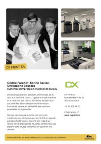 De la bureautique aux solutions connectées, de la GED aux solutions Cloud, CX garde son pas d'avance et le réserve à ses clients, afin des équiper face aux défis liés à l'accélération de l'information. La marque CX et son département R&D garantissent l'exclusivité, l'innovation et la fiabilité des solutions proposées.
